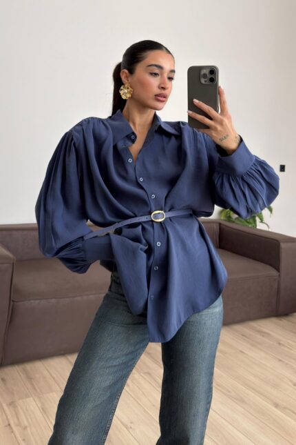 Vatkalı Kemerli Balon Kol Gömlek Mavi