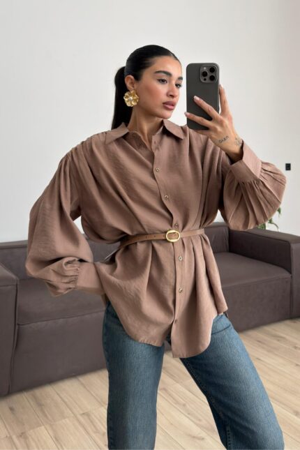 Vatkalı Kemerli Balon Kol Gömlek Vizon