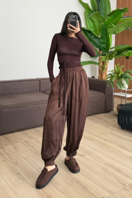 Paçası Düğmeli Saten Şalvar Pantolon Kahverengi