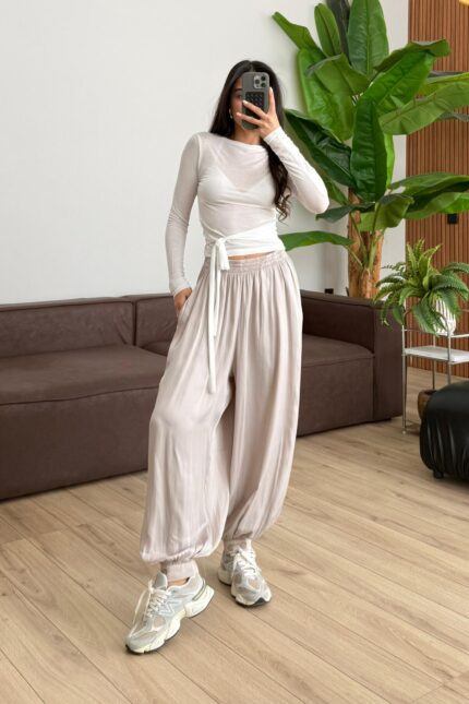 Paçası Düğmeli Saten Şalvar Pantolon Taş