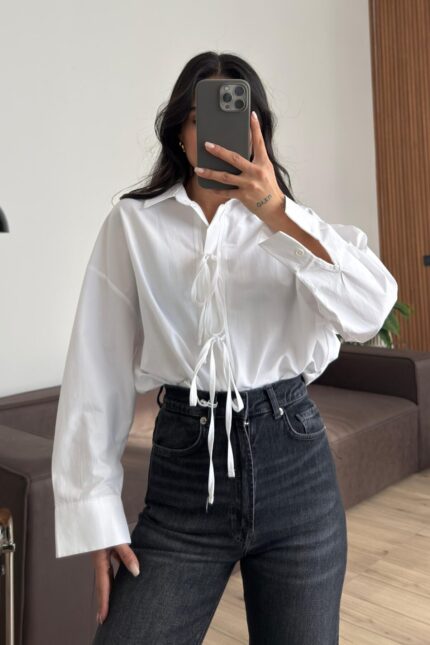 Önü Bağlamalı Poplin Gömlek Beyaz