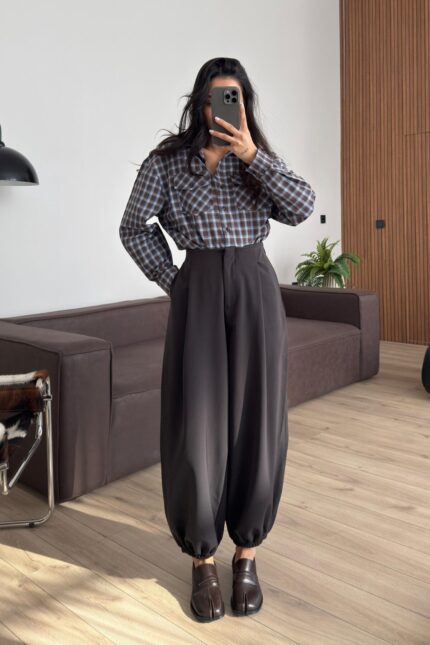 Paçası Lastikli Şalvar Pantolon Koyu Kahve
