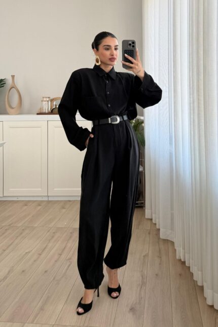 Çıtçıtlı Gömlek Kemerli Şalvar Pantolon Takım Siyah