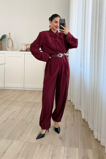Çıtçıtlı Gömlek Kemerli Şalvar Pantolon Takım Bordo