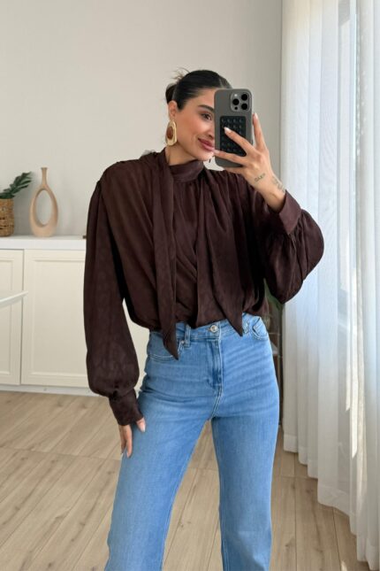 Beli Lastikli Boyundan Bağlamalı Bluz Kahverengi