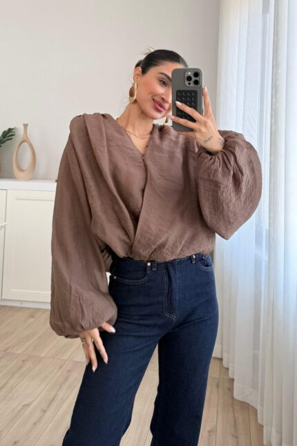 Kruvaze Vatkalı Tül Bluz Kahverengi