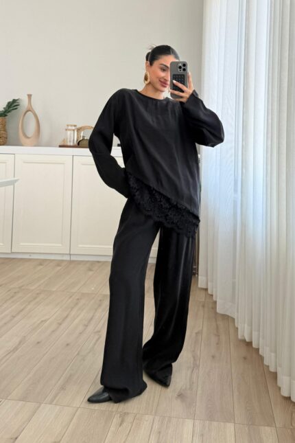 Asimetrik Dantel Detaylı Pantolon Takım Siyah