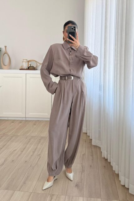 Çıtçıtlı Gömlek Kemerli Şalvar Pantolon Takım Vizon
