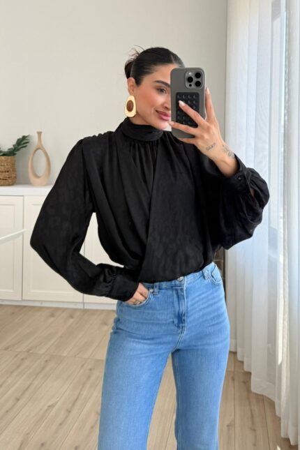 Beli Lastikli Boyundan Bağlamalı Bluz Siyah