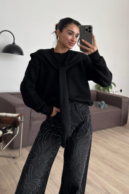 Asimetrik Belden Oturtmalı Pantolon Takım Siyah